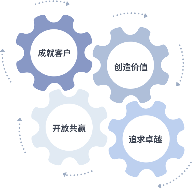 成就客户是一切决策的出发点,,,,创造价值是衡量所有工作的标准,,,追求卓越是我们做事做人的态度,,开放共赢是我们的格局也是最终的结果。。价值观的齿轮环环相扣,,,,推动着组织里的每个人不断向前。。。